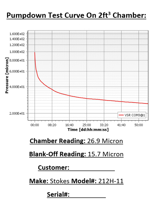 All reconditioned vacuum pumps and vacuum boosters are tested with the aid of our data acquisition software. Each unit is delivered with a documented pump down curve and blank off pressure data sheet.